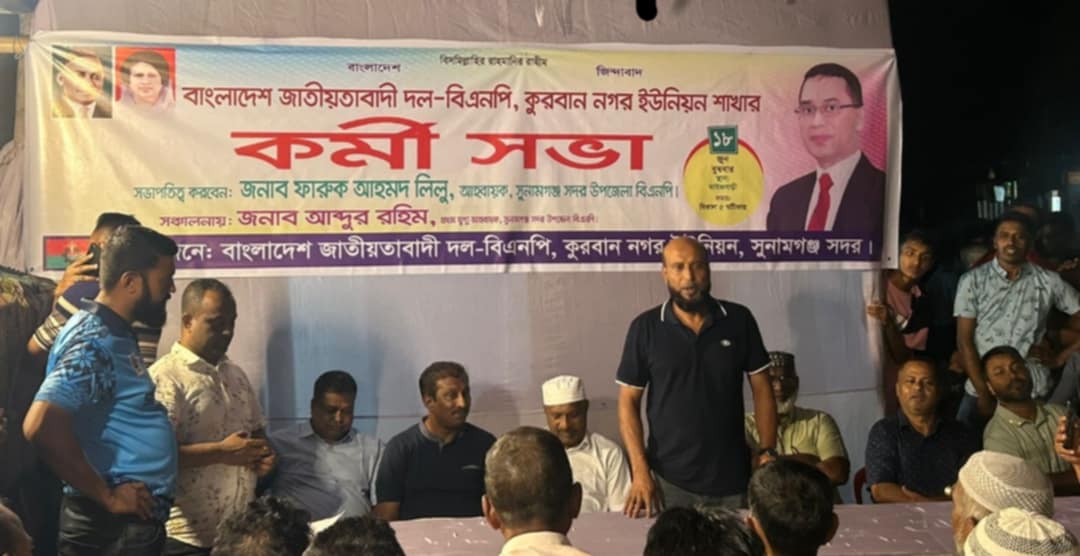 বাংলাদেশ জাতীয়তাবাদী দল বিএনপির সুনামগঞ্জ সদর উপজেলার কুরবান নগর ইউনিয়ন বিএনপি কর্মী সভা অনুষ্ঠিত হযেছে।