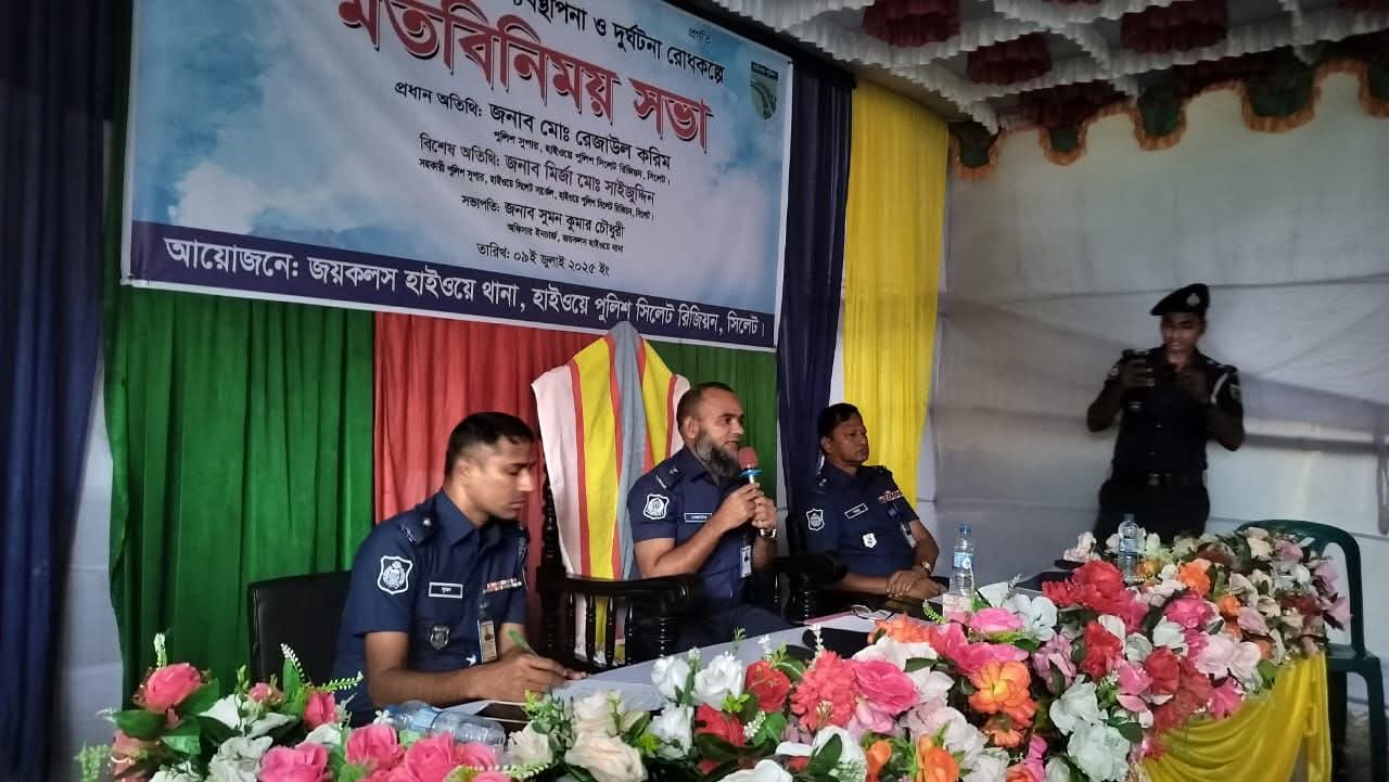 সিলেট-সুনামগঞ্জ আঞ্চলিক মহাসড়কের জয়কলস হাইওয়ে থানায় নিরাপদ মহাসড়ক ব্যবস্থাপনা ও দূর্ঘটনা রোধকল্পে মতবিনিময় সভা অনুষ্ঠিত হয়েছে। বুধবার ৯ জুলাই বিকেল ৩টায় ছাতকের ধারণ বাজার এলাকায় হাইওয়ে থানা প্রাঙ্গনে আয়োজিত মতবিনিময় সভায় প্রধান অতিথি হিসেবে বক্তব্য রাখেন, হাইওয়ে পুলিশ সিলেট রিজিয়নের পুলিশ সুপার মো. রেজাউল করিম। বিশেষ অতিথির বক্তব্য রাখেন, হাইওয়ে সিলেট রিজিয়নের সহকারী পুলিশ সুপার মির্জা মো. সাইজুদ্দিন।
