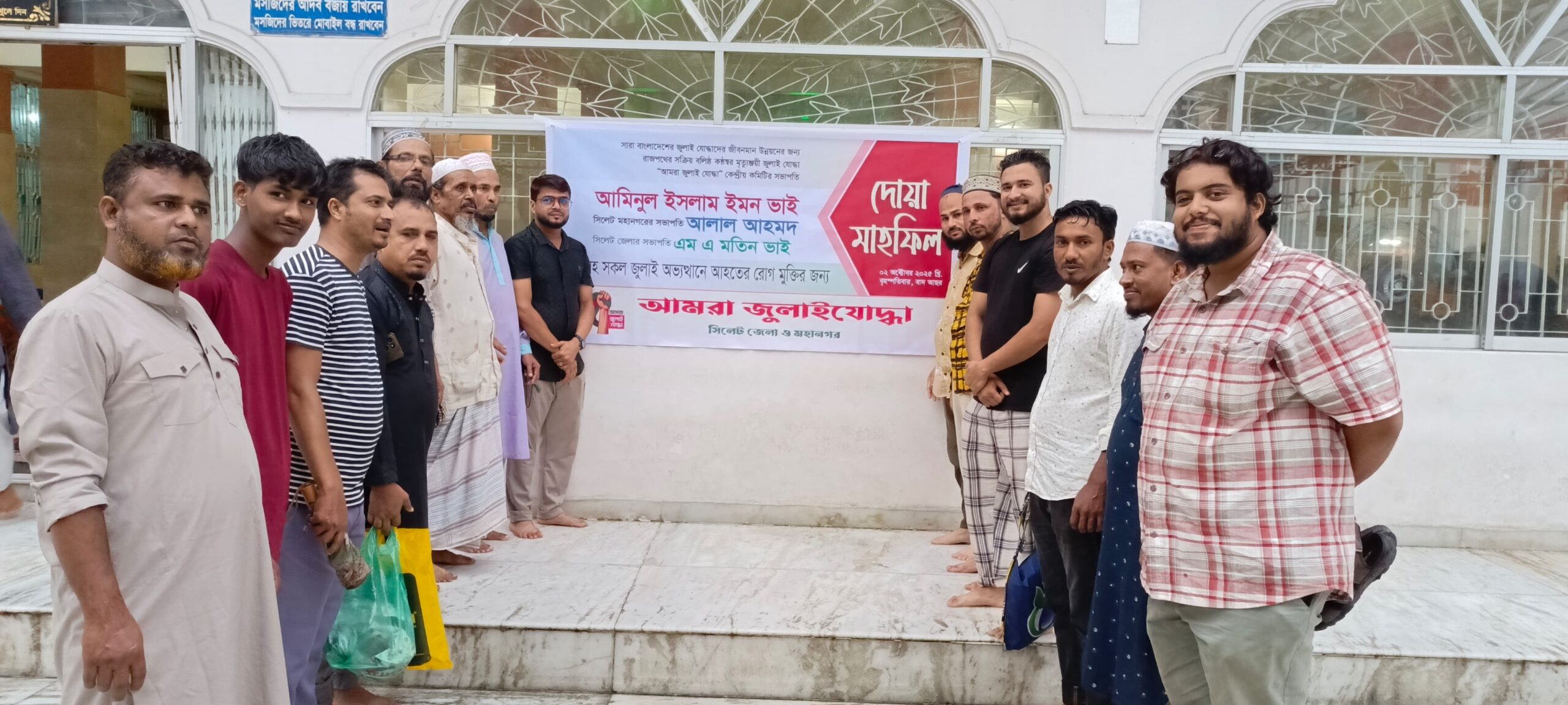 আমরা জুলাই যুদ্ধা কেন্দ্রীয় কমিটির সভাপতি আমিনুল ইসলাম ইমন গুরুতর অসুস্থ এবং চিকিৎসাধীন আছেন । সিলেট মহানগর সভাপতি আলাল আহমদ গুরুতর অসুস্থ ঢাকা একটি হসপিটালে চিকিৎসাধীন আছেন ।সিলেট জেলা সভাপতি এম এ মতিন উন্নত চিকিৎসার জন্য থাইল্যান্ডের একটি হাসপাতালে চিকিৎসাধীন আছেন জুলাই যুদ্ধা গুরুতর আহত সহ আরো অনেক দেশে এবং বিদেশে চিকিৎসাধীন তাদের সুস্বাস্থ্যের জন্য দোয়া মাহফিল আয়োজন করা হয়।