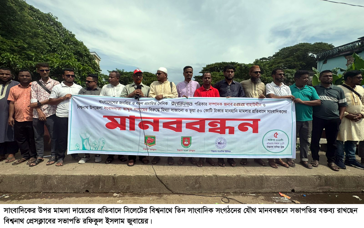 সাংবাদিকের বিরুদ্ধে মামলা দায়ের প্রতিবাদেবিশ্বনাথে তিন সংগঠনের যৌথ মানববন্ধন