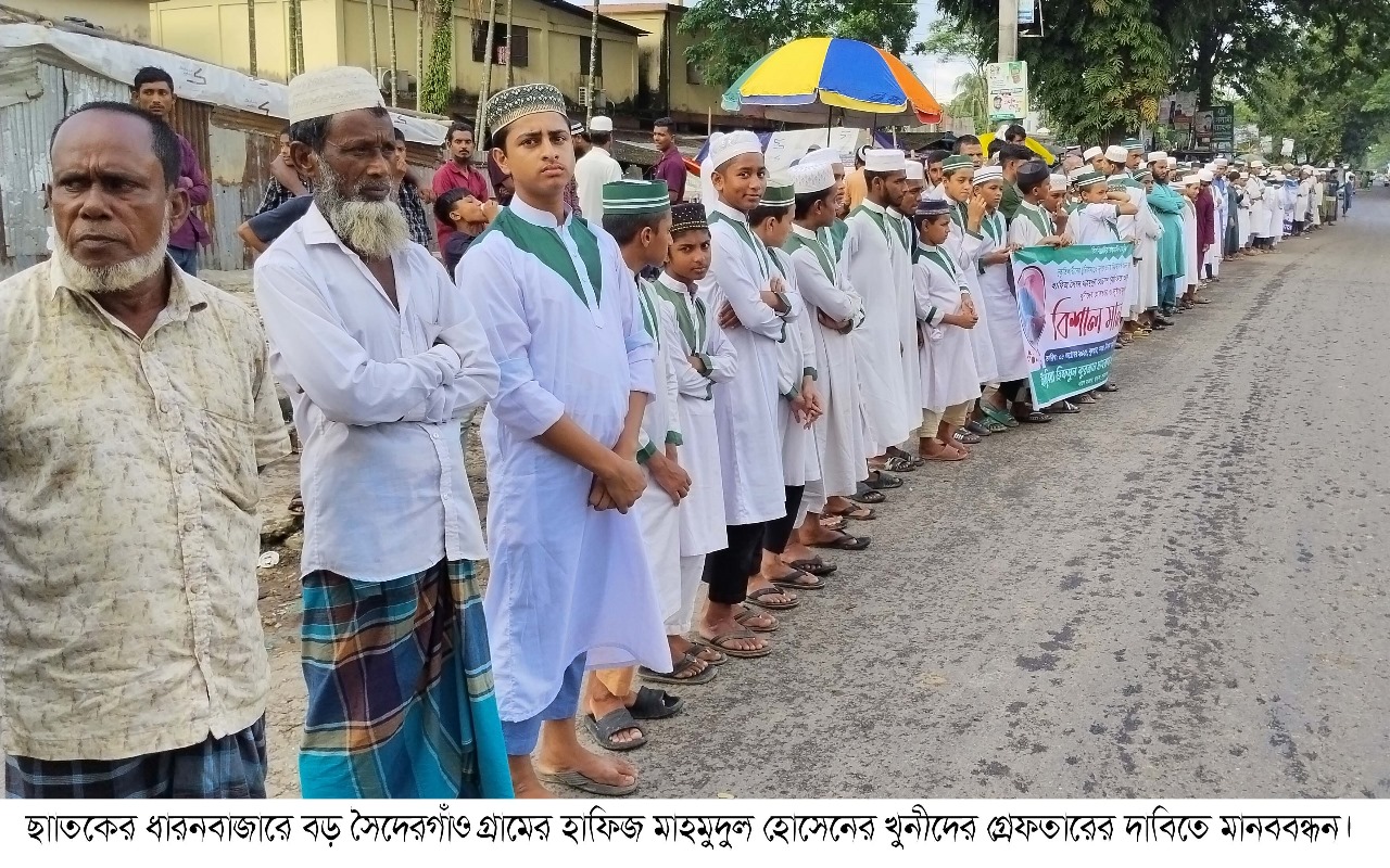 ছাতকে নিহত হাফিজ সৈয়দ মাহমুদুল হোসেনের খুনীদের গ্রেফতারের দাবিতে হাজারো ছাত্রজনতার মানববন্ধন