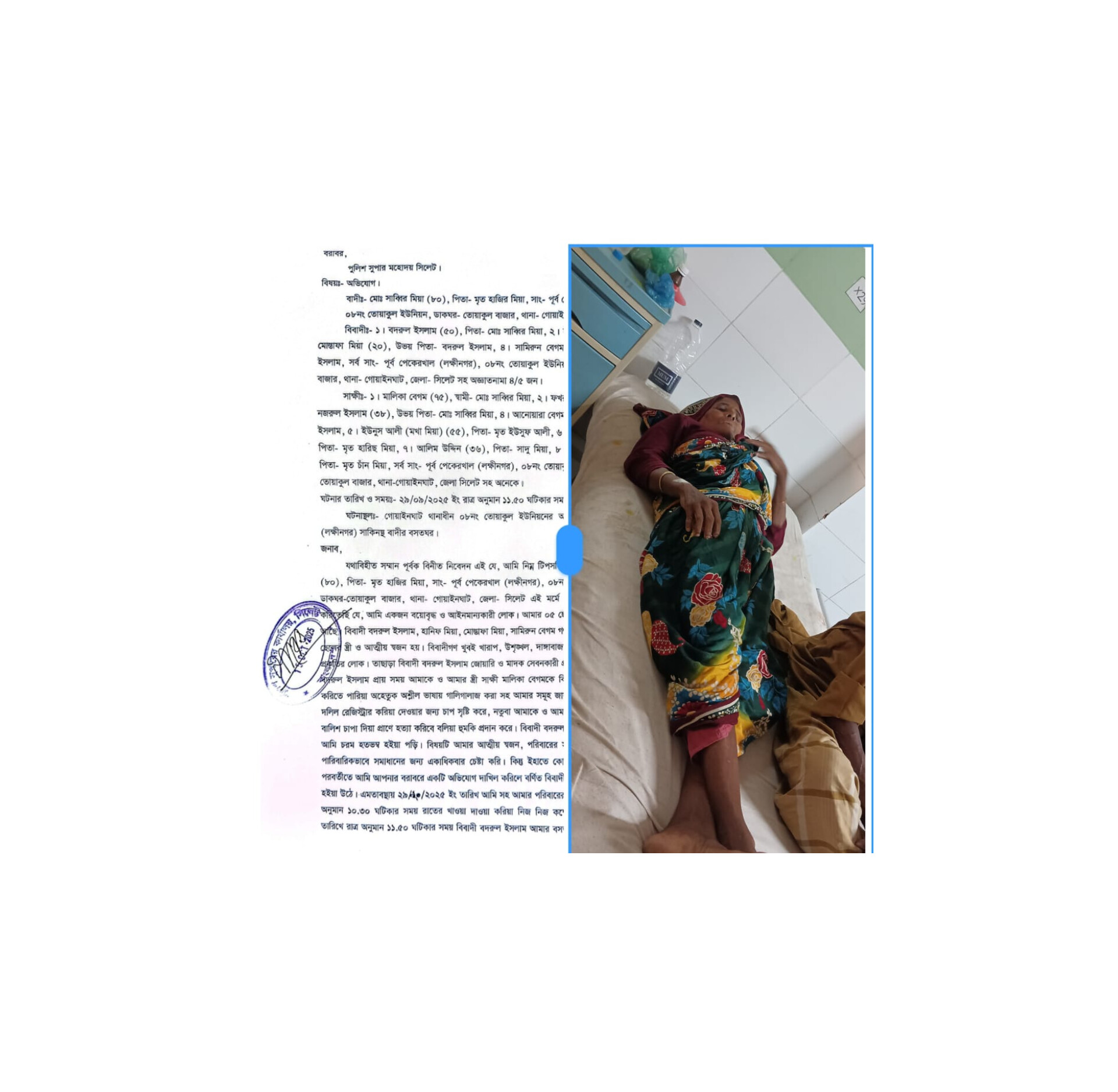 আহত মালিকা বেগমকে এলাকাবাসী ও পরিবারের সদস্যদের সহায়তায় দ্রুত সিলেট এম.এ.জি. ওসমানী মেডিকেল কলেজ হাসপাতালের জরুরি বিভাগে ভর্তি করে প্রাথমিক চিকিৎসা দেয়া হয়। বর্তমানে তিনি হাসপাতালে চিকিৎসাধীন আছেন — এমনটাই অভিযোগে উল্লেখ করা হয়েছে। অভিযোগকারী জানান, তিনি বয়স্ক ও স্বাভাবিক জীবনযাপনের লোক; অভিযুক্তদের কট্টর আচরণ, জোয়াড়ি-মাদক সেবন ও ভূমি আত্মসাৎচেষ্টার কারণে পরিবারে নিরাপত্তাহীনতার সৃষ্টি হয়েছে।