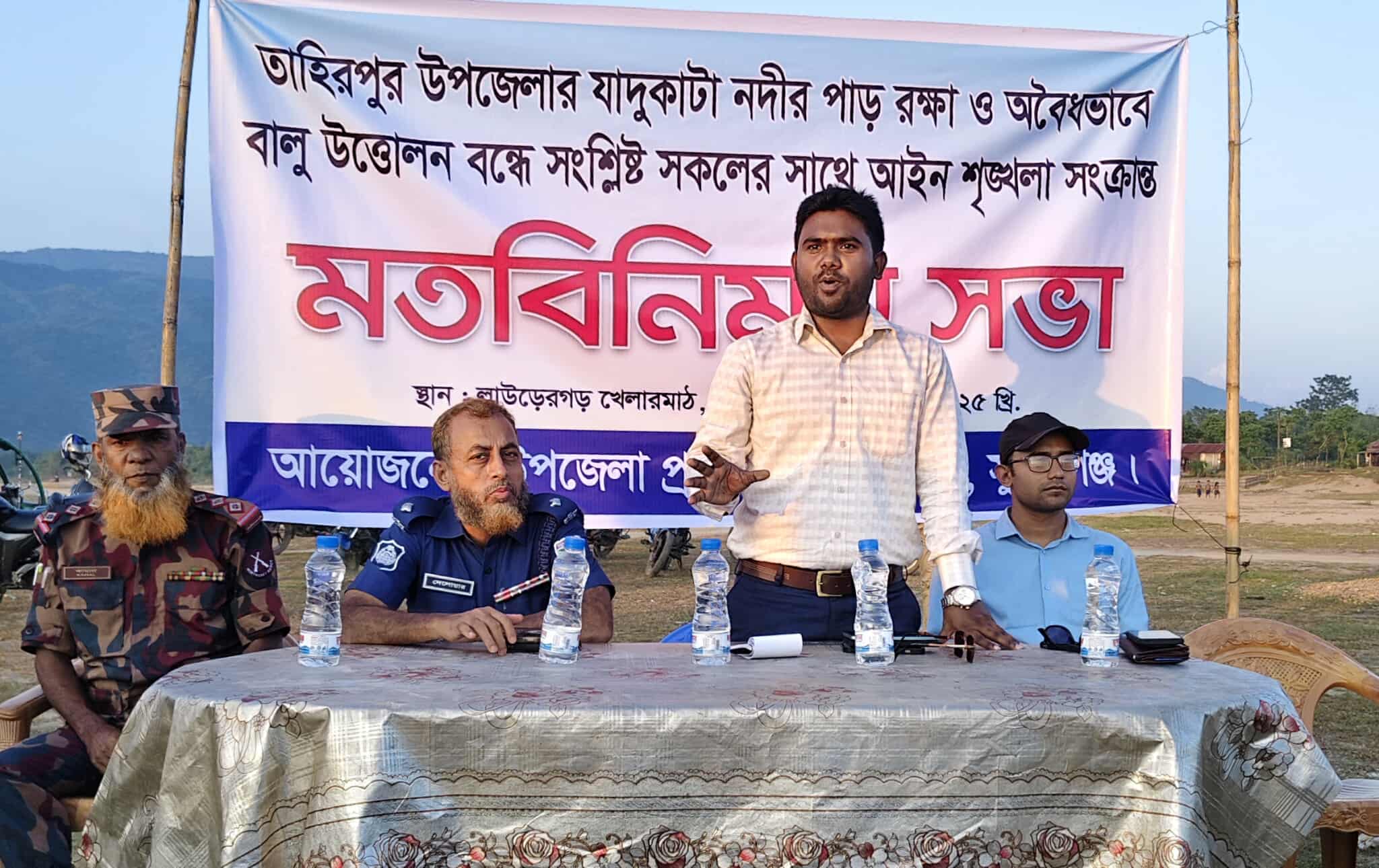 তাহিরপুর প্রতিনিধি :: সুনামগঞ্জের তাহিরপুর উপজেলার যাদুকাটা নদীর পাড় রক্ষা ও অবৈধভাবে বালু উত্তোলন বন্ধে সংশ্লিষ্ট সকলের সাথে আইন শৃঙ্খলা সংক্রান্ত মতবিনিময় সভা অনুষ্ঠিত হয়েছে। বুধবার (১৪ অক্টোবর) বিকেলে তাহিরপুর উপজেলা প্রশাসনের আয়োজনে যাদুকাটা নদীর তীরে লাউড়েরগড় খেলার মাঠে এই মতবিনিময় সভা অনুষ্ঠিত হয়৷ সভায় সভাপতিত্ব করেন তাহিরপুর উপজেলা নির্বাহী কর্মকর্তা মো. মেহেদী হাসান মানিক।