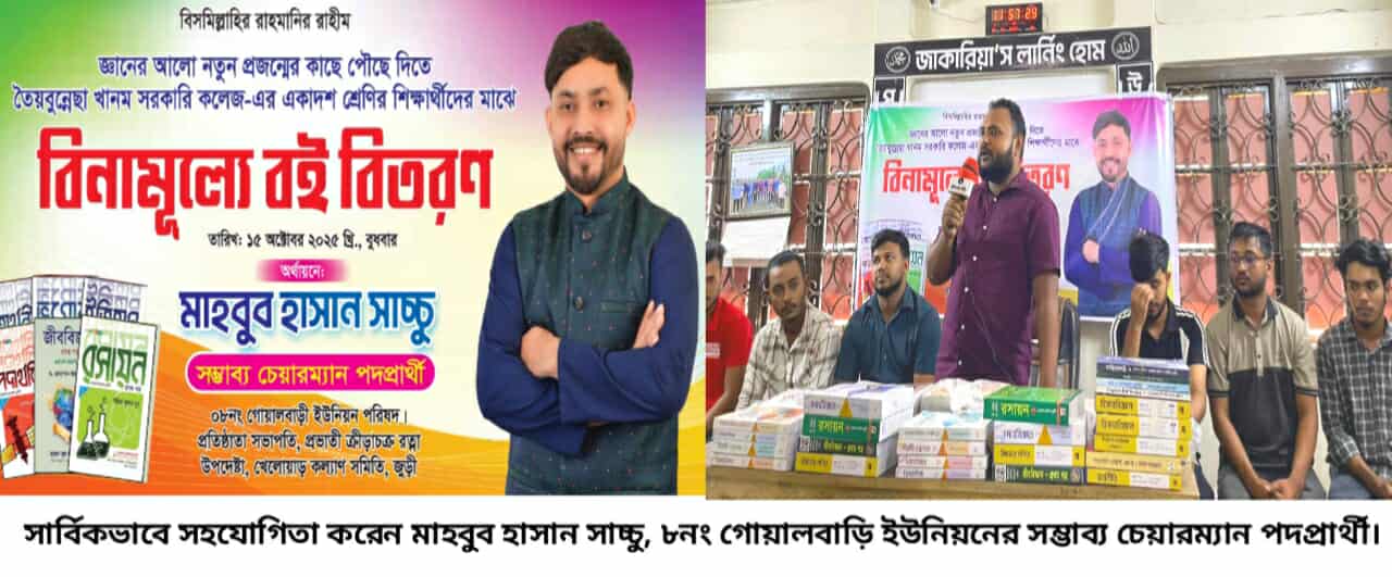 জ্ঞানের আলো নতুন প্রজন্মের মাঝে তৈয়বুন্নেছা খানম সরকারি কলেজে একাদশ শ্রেণির শিক্ষার্থীদের মাঝে বিনামূল্যে বই বিতরণ সার্বিক সহযোগিতা করেন মাহবুব হাসান সাচ্চু
