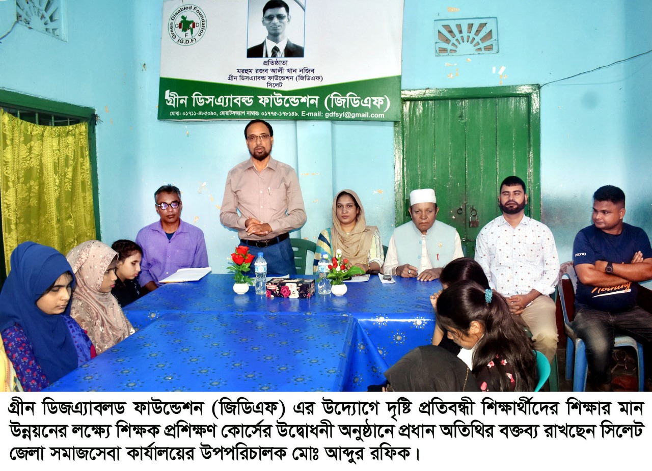 ৮ নভেম্বর শনিবার সকাল ১১ টায় নগরীর জিন্দাবাজারস্থ জিডিএফ’র কার্যালয়ে আয়োজিত শিক্ষক প্রশিক্ষণের উদ্বোধন করেন প্রধান অতিথি সিলেট জেলা সমাজসেবা কার্যালয়ের উপপরিচালক মোঃ আব্দুর রফিক। এ সময় তিনি বলেন, প্রশিক্ষণ কর্মশালার মাধ্যমে শিক্ষকদের অভিজ্ঞতা বৃদ্ধি পায়। দৃষ্টি প্রতিবন্ধী শিক্ষার্থীদের শিক্ষার গুণগত মান বৃদ্ধিতে এ ধরনের প্রশিক্ষণ সময় উপযোগী প্রদক্ষেপ। প্রতিবন্ধী শিক্ষার্থীদের শিক্ষার মান উন্নয়নে শিক্ষক প্রশিক্ষণের বিকল্প নেই।