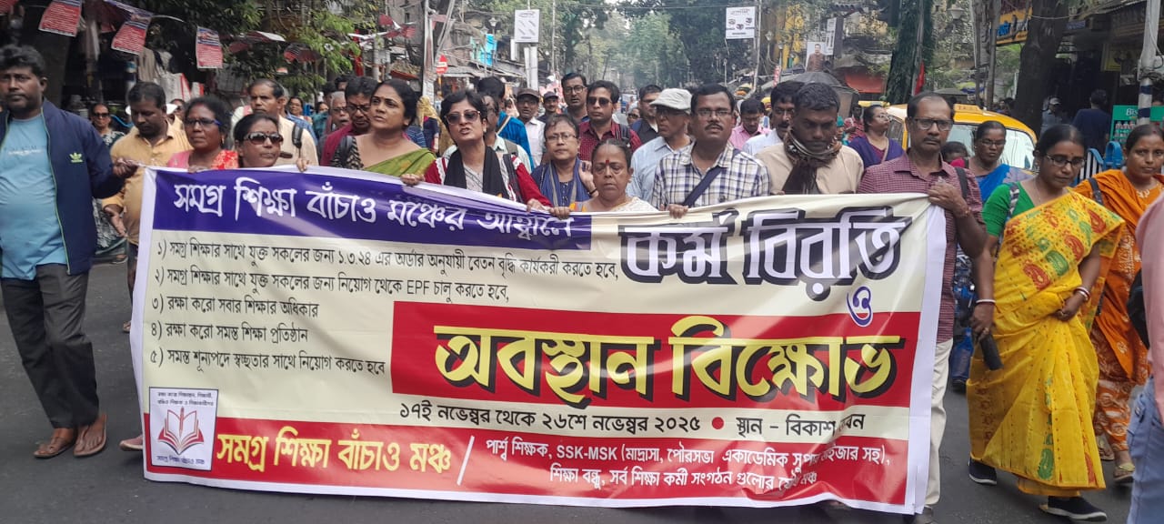 রিপোর্টার, সমরেশ রায় ও শম্পা দাস, কলকাতা, পশ্চিমবঙ্গ ২১ শে নভেম্বর শুক্রবার, ঠিক দুপুর একটায়, সমগ্র শিক্ষা বাঁচাও মঞ্চের আওহানে, শিয়ালদা স্টেশনের কাছ থেকে কয়েকশো পার্শ্ব শিক্ষক একত্রিত হয়ে মিছিল করে এস এন ব্যানার্জি রোড ধরে ধর্মতলা ডরিনা ক্রসিং এ উপস্থিত হন এবং ধর্মতলা ডরিনা ক্রসিং এ বিক্ষোভ দেখাতে থাকেন, পরে প্রশাসনের মধ্যস্থতায় বিক্ষোভ মিছিল ওয়াই চ্যানেলে গিয়ে উপস্থিত হয় এবং ডেপুটেশন দিতে যান।