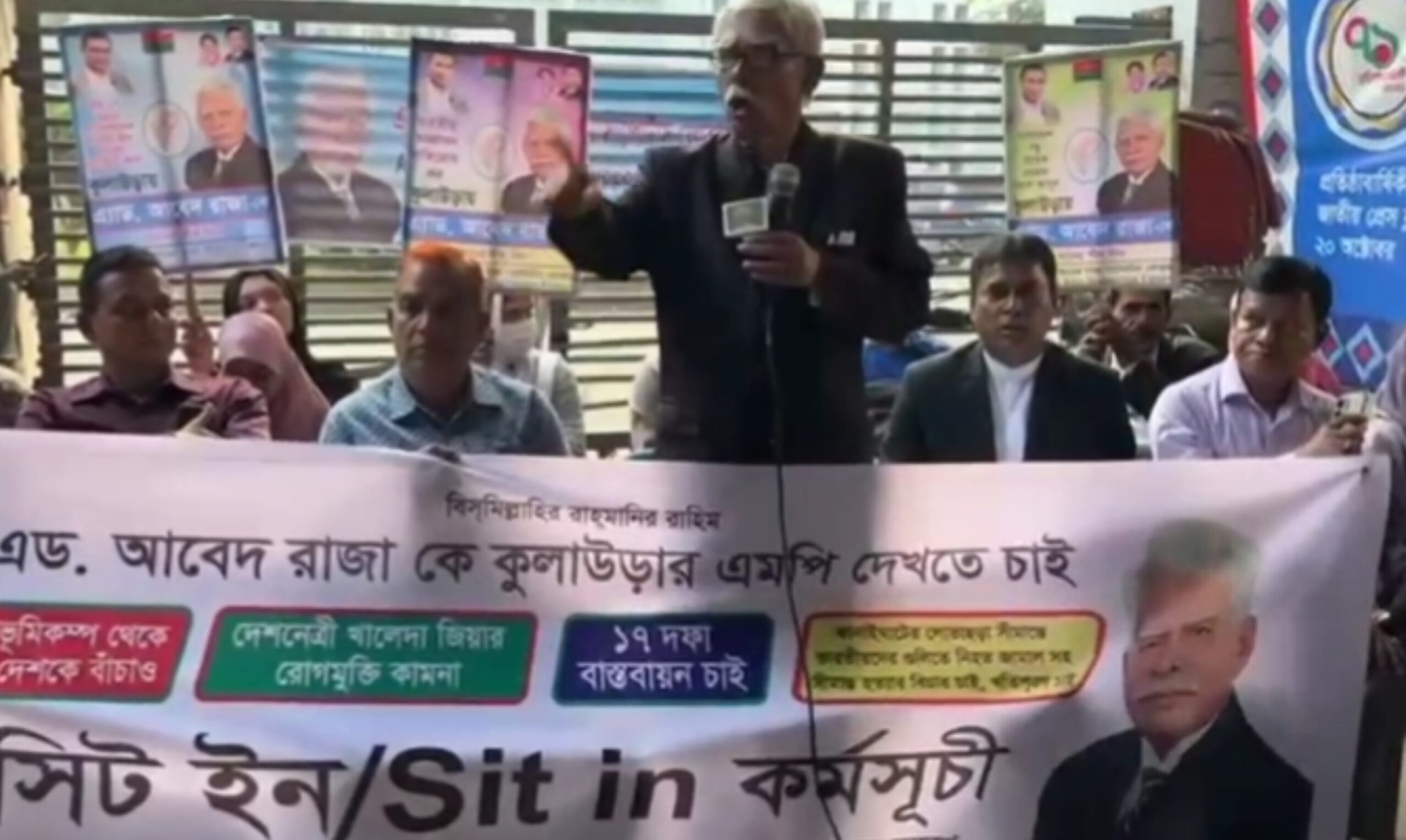 খালেদা জিয়ার রোগ মুক্তি কামনা, এড আবেদ রাজা-কে কুলাউড়ায় ধানের শীষের প্রার্থী ঘোষণা, ভূমিকম্প থেকে দেশকে রক্ষা ও ১৭ দফা বাস্তবায়নের দাবীতে "এডভোকেট আবেদ রাজা সাপোর্টার্স ফোরাম" এর উদ্যোগে ২৫ নভেম্বর,২৫- মংগলবার বিকেলে জাতীয় প্রেস ক্লাব, ঢাকার সন্মুখে 'সিট ইন' কর্মসূচীতে বক্তব্য রাখেন কারানির্যাতিত এবং ফ্যাসিষ্ট বিরোধী আন্দোলনের সাহসী নেতৃত্ব, সিলেট বিভাগবন্ধু এড আবেদ রাজা।