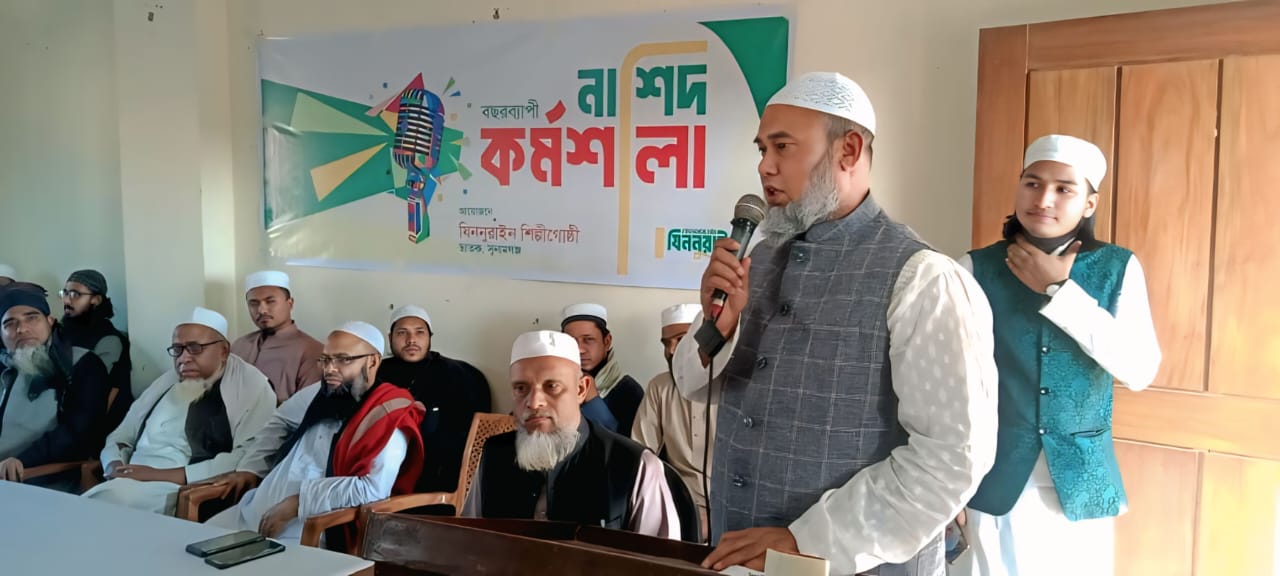 সেলিম মাহবুবঃ :: ছাতকে যিননুরাইন শিল্পী গোষ্ঠীর আয়োজনে শুক্রবার বিকেলে ছাতক জালালিয়া ফাজিল ডিগ্রি মাদ্রাসা হল রুমে বছর ব্যাপী নাশিদ কর্মশালায় ছাতক থানা জামে মসজিদের ইমাম ও যিননুরাইন শিল্পী গোষ্ঠীর পরিচালক মাওলানা জামিল আহমদ'র সভাপতিত্বে ও সহকারী পরিচালক মাওলানা আবিদ আহমেদের পরিচালনায় কর্মশালায় প্রধান অতিথি হিসেবে বক্তব্য রাখেন ছাতক থানার অফিসার ইনচার্জ (ওসি) সফিকুল ইসলাম খান।