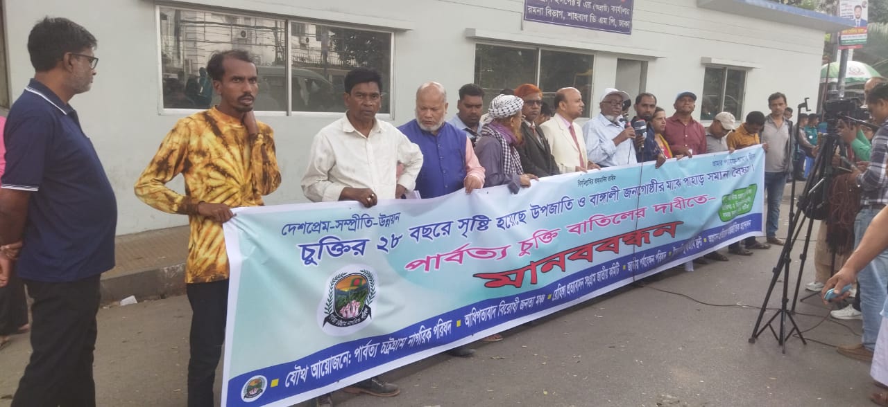 পার্বত্য চট্টগ্রাম চুক্তির ২৮ বছর এই কালো চুক্তি বাতিলের দাবিতে ঢাকা জাতীয় প্রেসক্লাবের সামনে মানববন্ধন অনুষ্টিত