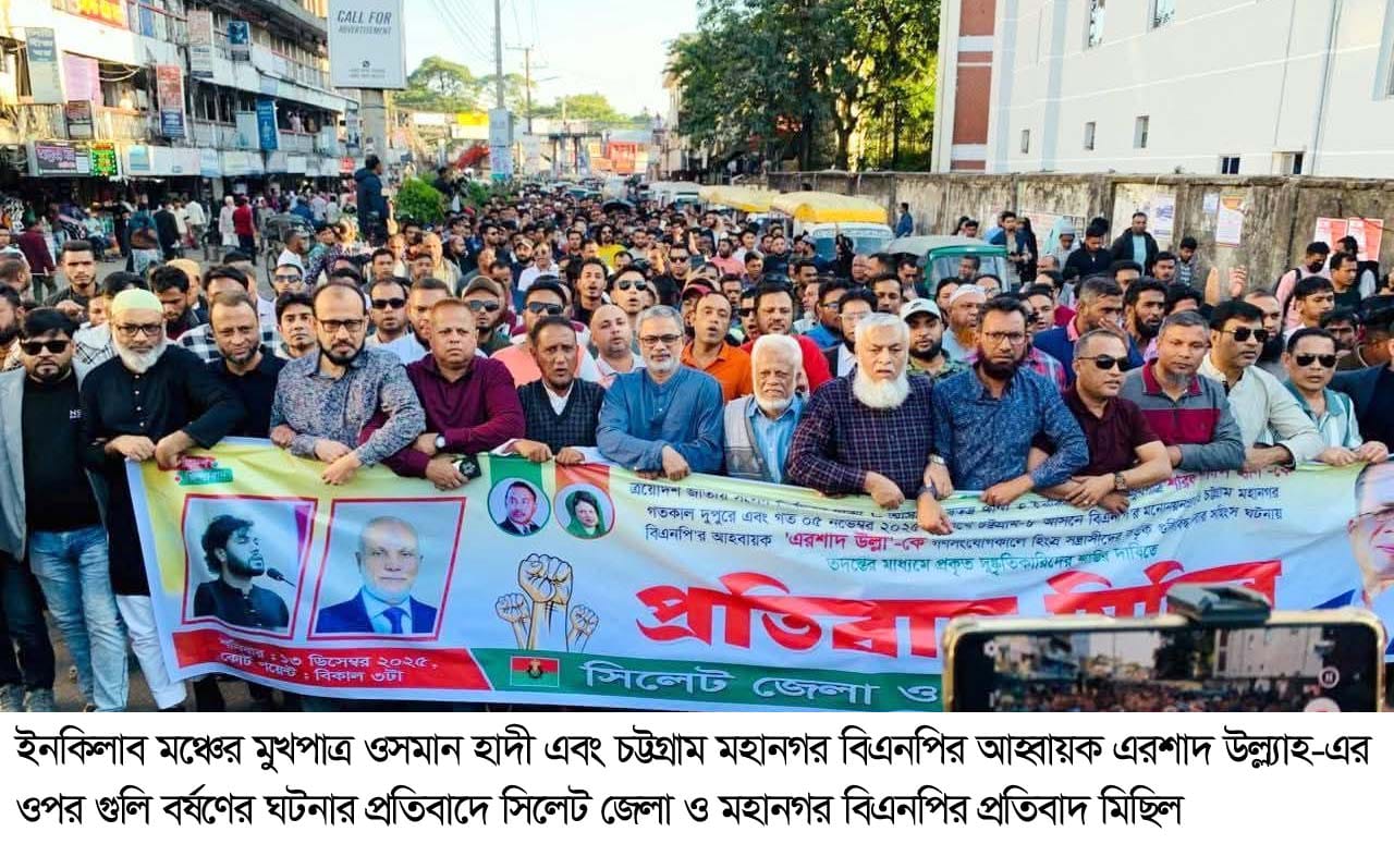 গুলি বর্ষণের ঘটনায় জড়িতদের গ্রেপ্তার ও দৃষ্টান্তমূলক শাস্তির দাবি সিলেট জেলা ও মহানগর বিএনপির