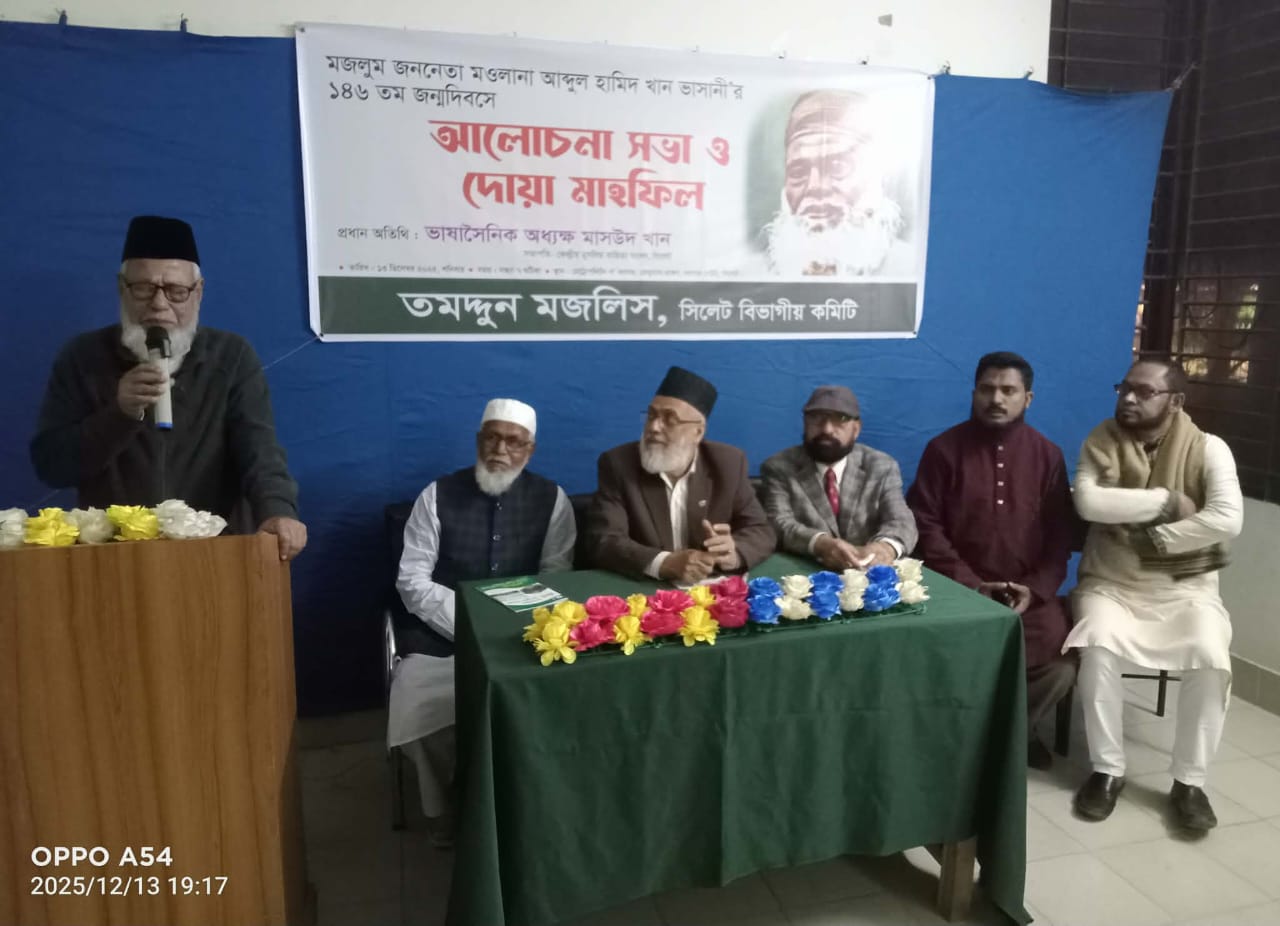তিনি আরও বলেন, মওলানা ভাসানীর রাজনীতি ছিল সম্পূর্ণ মানবমুখী এবং নিপীড়িত মানুষের মুক্তির পক্ষে দৃঢ় অবস্থাননির্ভর। তিনি পবিত্র কুরআনের সেই আয়াত— “তোমাদের কী হলো যে তোমরা আল্লাহর পথে সংগ্রাম করছ না অসহায় নরনারী ও শিশুদের জন্য, যারা বলে— হে আমাদের রব! এই জালিম অধিবাসীদের জনপদ থেকে আমাদের মুক্তি দাও; তোমার পক্ষ থেকে আমাদের একজন অভিভাবক দাও, একজন সহায় দাও”— এর আলোকে তাঁর জীবনব্যাপী সংগ্রাম পরিচালনা করেছেন। জনগণের অধিকার, ন্যায়বিচার এবং জুলুমের বিরুদ্ধে তিনি আজীবন আপোসহীন ছিলেন। তিনি আরও বলেন, মওলানা ভাসানী বিশ্বাস করতেন ‘রবুবিয়াত বা পালনবাদের ভিত্তিতে’ রাষ্ট্রীয় সকল সমস্যার সমাধান সম্ভব এবং একমাত্র রবুবিয়াতের আদর্শই মানুষে মানুষে প্রকৃত ভ্রাতৃত্ব প্রতিষ্ঠা করতে পারে। সভায় তমদ্দুন মজলিস সিলেট জেলা কমিটির সভাপতি ড. মো. তুতিউর রহমান বলেন, মওলানা ভাসানী ছিলেন দূরদর্শী রাষ্ট্রনায়ক, স্বাধীনতা-চেতনার প্রেরণাদাতা এবং আওয়ামী মুসলিম লীগের প্রতিষ্ঠাতা। তাঁর মানবিকতা, সংগ্রামী জীবন ও সাহসী নেতৃত্ব তরুণ সমাজের জন্য অনুকরণীয় দৃষ্টান্ত।সভাপতির বক্তব্যে প্রিন্সিপাল লে. কর্নেল (অব.) এম আতাউর রহমান পীর বলেন, “মওলানা ভাসানী শুধু একজন রাজনৈতিক নেতা নন, তিনি ছিলেন একজন সত্যিকারের সমাজসংস্কারক। তিনি গ্রামীণ জনপদের গরিব-দুঃখী মানুষের কল্যাণে নিজের ব্যক্তিজীবন পর্যন্ত উৎসর্গ করেছিলেন। আজকের বাংলাদেশে বৈষম্য, দুর্নীতি ও অবিচারের বিরুদ্ধে সংগ্রামে ভাসানীর চিন্তা-চেতনা আমাদের স্পষ্ট পথনির্দেশনা দেয়।” তিনি আরও বলেন, “ভাসানীর রাজনীতি ছিল জনকল্যাণনির্ভর। তাঁর আদর্শ রক্ষা করার অর্থ হচ্ছে সত্য, ন্যায়, সাহস ও মানবিকতার প্রতি আমাদের প্রতিশ্রুতি পুনর্নিশ্চিত করা।”