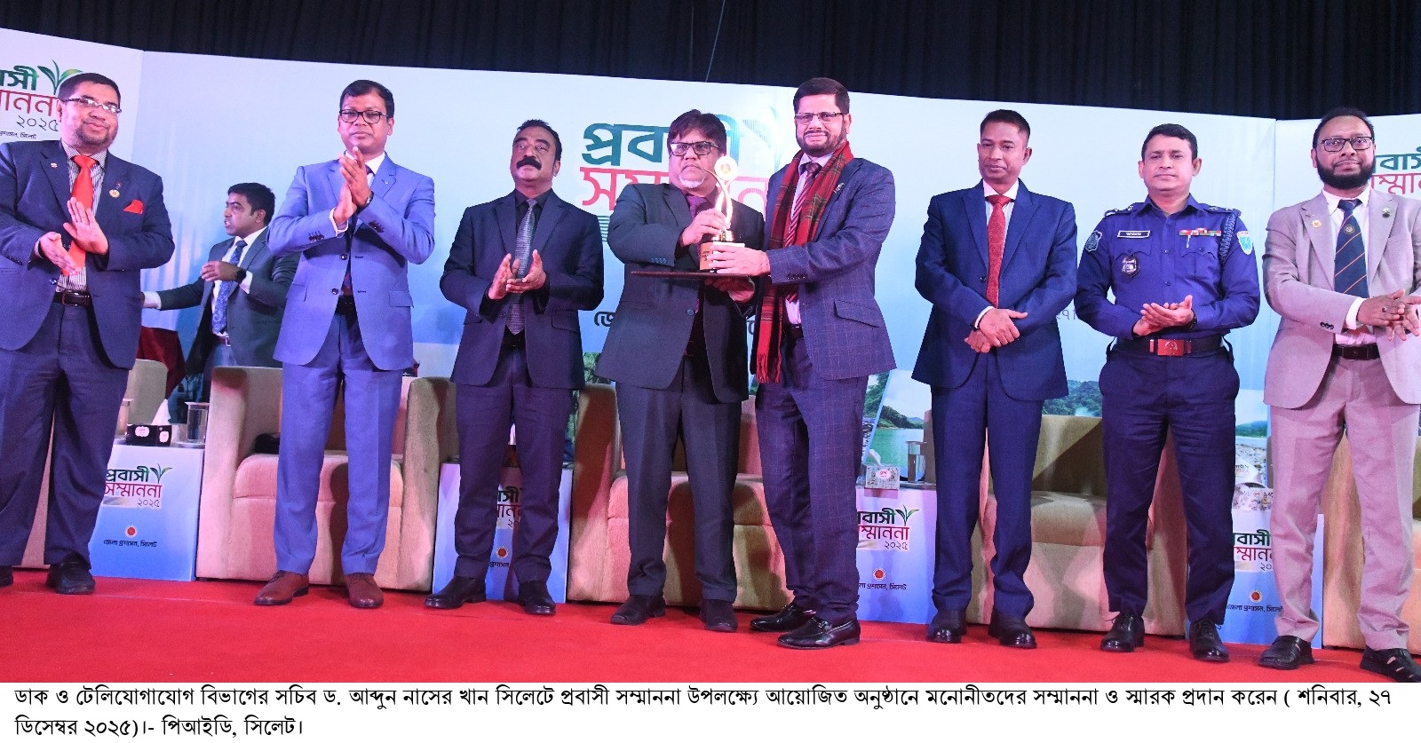 সিলেটে প্রবাসী সম্মাননা প্রদান কালে ডাক ও টেলিযোগাযোগ সচিব প্রবাসীরা বাংলাদেশের গর্ব ও হৃৎস্পন্দন #১০৩ জনকে ছয়টি ক্যাটাগরিতে সম্মাননা প্রদান করা হয়#
