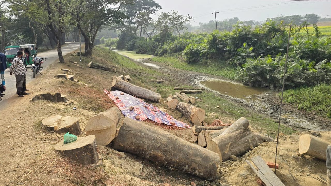 গোয়াইনঘাট পিরের বাজার রোডে সরকারি অনুমতি ছাড়া রাস্তার গাছ কর্তন