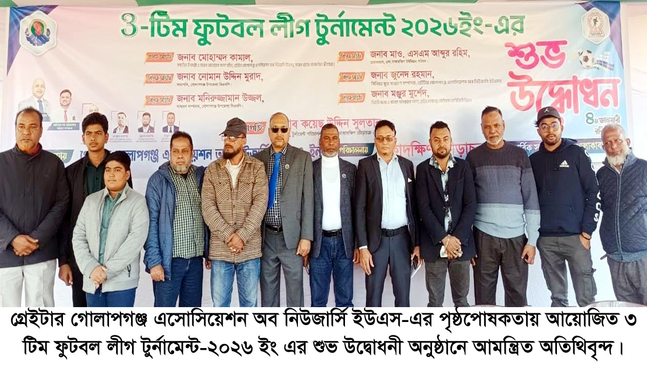 গ্রেইটার গোলাপগঞ্জ এসোসিয়েশন অব নিউজার্সি ইউএস-এর পৃষ্ঠপোষকতায় আয়োজিত ৩ টিম ফুটবল লীগ টুর্নামেন্ট-২০২৬ ইং এর শুভ উদ্বোধনী অনুষ্ঠানে আমন্ত্রিত অতিথিবৃন্দ।