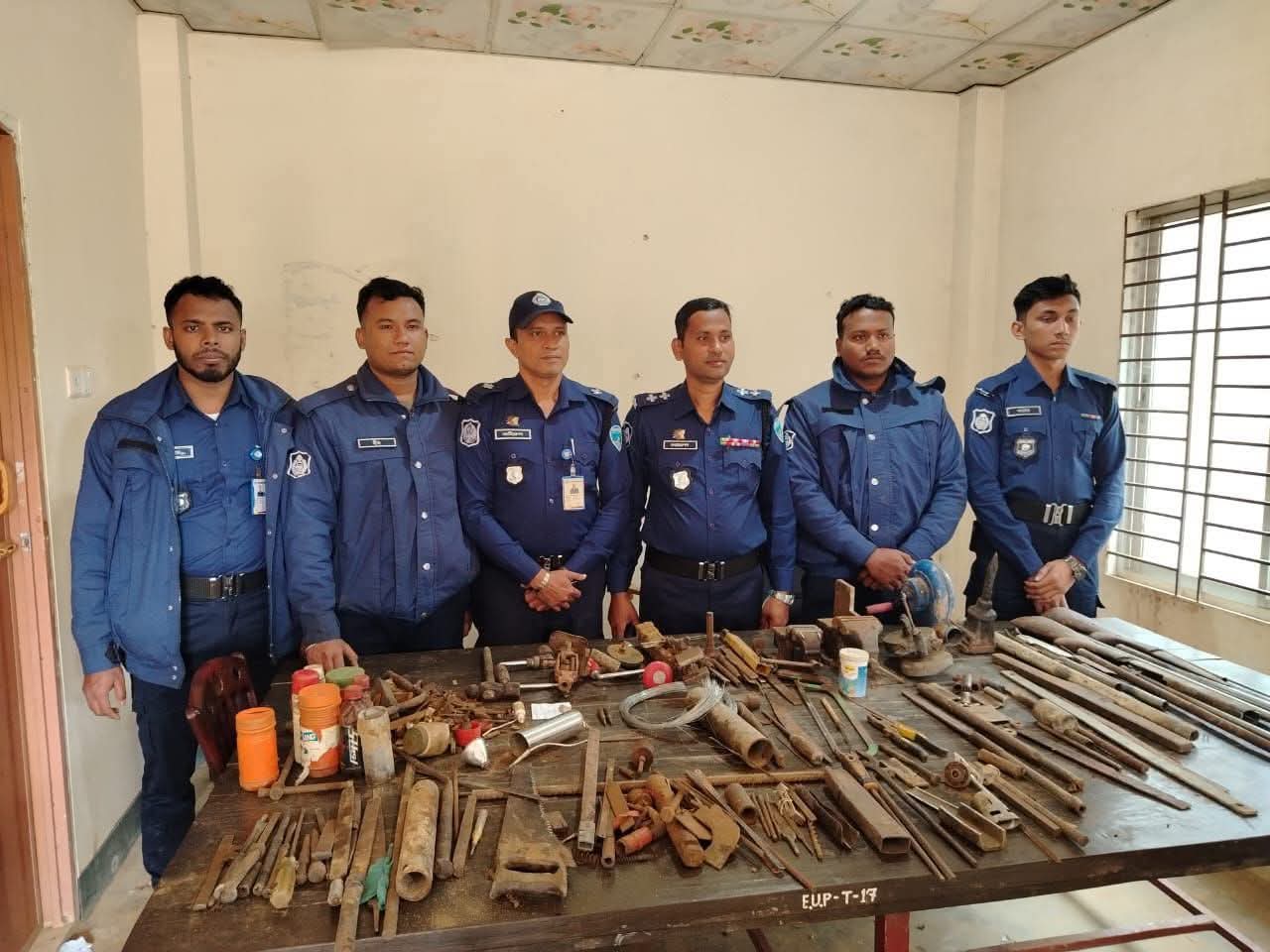 উদ্ধারকৃত আলামত: ১) ২টি তাজা রাইফেলের গুলি, ২) ০৪টি শর্টগানের খালি খোসা, ৩) ২টি বন্দুকের বাট, ৪) ০৩টি বন্দুকের ট্রিগার বক্স, ৫) ০৬টি বন্দুকের নল হিসেবে ব্যবহারের পাইপ, ৬) ০৩টি বন্দুক তৈরির যোগান, ৭) ০১টি হাওয়ার মেশিন, ৮) ০২টি বাটাল, ৯) ০৫টি আড়ি বেøড ও ০১টি আড়ি বেøডের ফ্রেম, ১০) ০১টি করাত, ১১) ০১টি হাতুড়ি, ১২) ০১টি প্লাস, ১৩) ০৭টি ছোট বড় রেথ, ১৪) ০১টি শান দেওয়ার মেশিন, ১৫) ০১টি বানান নালী সহ অসংখ্য অস্ত্র তৈরির সাজ সরঞ্জামাদি।
