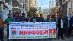 চট্টগ্রামের কাতালগন্জ হাজী দুদু মিয়া টাওয়ার নির্মানের পাওনা টাকা আদায়ের জন্য বাংলাদেশ নির্মান শ্রমিক কর্মচারী ফেডারেশনের মানব বন্ধন