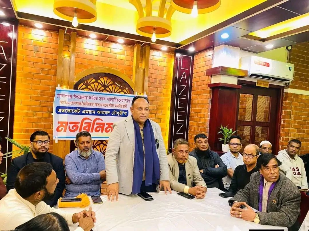 তিনি আরও বলেন- আমার জন্ম, শৈশব-কৈশোর- বেড়ে উঠা সব এই জনপদে, আপনাদের সামনে। গোলাপগঞ্জ-বিয়ানীবাজারের মানুষই আমার অভিভাবক। ছাত্রত্বকাল থেকে বিএনপির রাজনীতির সঙ্গে সম্পৃক্ত হই। বিভিন্ন সময়ে দল আমাকে অনেক গুরুত্বপূর্ণ দায়িত্ব দিয়েছে। সেসব দায়িত্ব জান বাজি রেখে নিষ্ঠার সঙ্গে পালনের চেষ্টা করেছি। যার পুরস্কার স্বরূপ আসন্ন নির্বাচনে সিলেট-৬ আসনে আমাকে আমার দল মনোনয়ন দিয়েছে। এখন পর্যন্ত দলের বার্তা অনুযায়ী- আমিই এখানে চূড়ান্ত প্রার্থী। বিকল্প প্রার্থীর বিষয়ে দলের মহাসচিব সেদিন সিলেটে স্পষ্ট বক্তব্য দিয়ে গেছেন। সুতরাং এ বিষয়ে আর কোনো বিতর্ক, বিভ্রান্তি বা অস্পষ্টতা থাকতে পারে না। তাই আগামীর দিনগুলোতে আমি গোলাপগঞ্জের সম্মানিত সব সাংবাদিকের ঐকান্তিক সহযোগিতা কামনা করছি। সিলেট-৬ আসনের উন্নয়নের স্বার্থে ভুল হলে ধরিয়ে দিবেন, এগিয়ে যাওয়ার পথে পরম বন্ধু হয়ে পাশে থাকবেন। আমি বিজয়ী হলে আপনাদের এমপি হবো না, সেবক হবো। আমার কাজকে আপনাদের সব সময় চ্যালেঞ্জ করার অধিকার থাকবে।