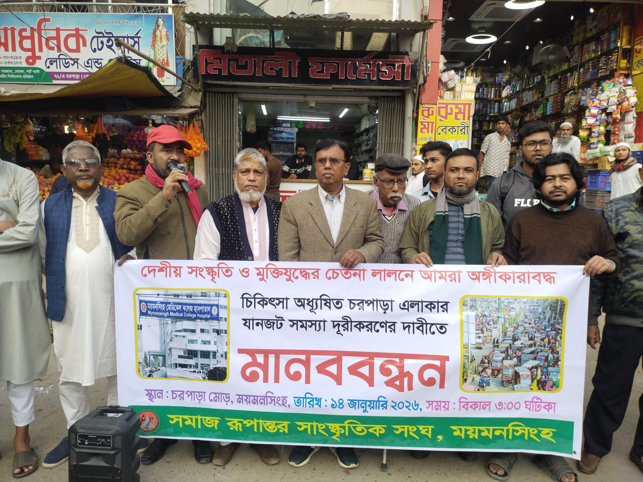 ময়মনসিংহের চরপাড়া এলাকায় যানজট নিরসনের দাবীতে মানববন্ধন অনুষ্ঠিত