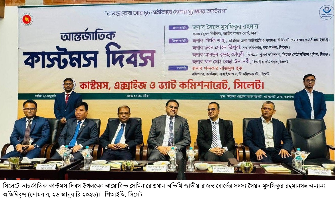এমদাদুর রহমান চৌধুরী জিয়া,:: আন্তর্জাতিক কাস্টমস দিবস উপলক্ষ্যে সিলেট কাস্টমস, এক্সাইজ ও ভ্যাট কমিশনারের উদ্যোগে সেমিনার অনুষ্ঠিত হয়েছে। সোমবার (২৬ জানুয়ারি) সকালে নগরীর এয়ারপোর্ট রোডের বড়শালায় উইন্ডসর হোটেল অ্যান্ড রিসোর্টে আয়োজিত সেমিনারে প্রধান অতিথি হিসেবে উপস্থিত ছিলেন জাতীয় রাজস্ব বোর্ডের সদস্য (মূসক নিরীক্ষা) সৈয়দ মুসফিকুর রহমান। এতে সভাপতিত্ব করেন কাস্টমস, এক্সাইজ ও ভ্যাট কমিশনারেট, সিলেটের কমিশনার খন্দকার নাজমুল হক।