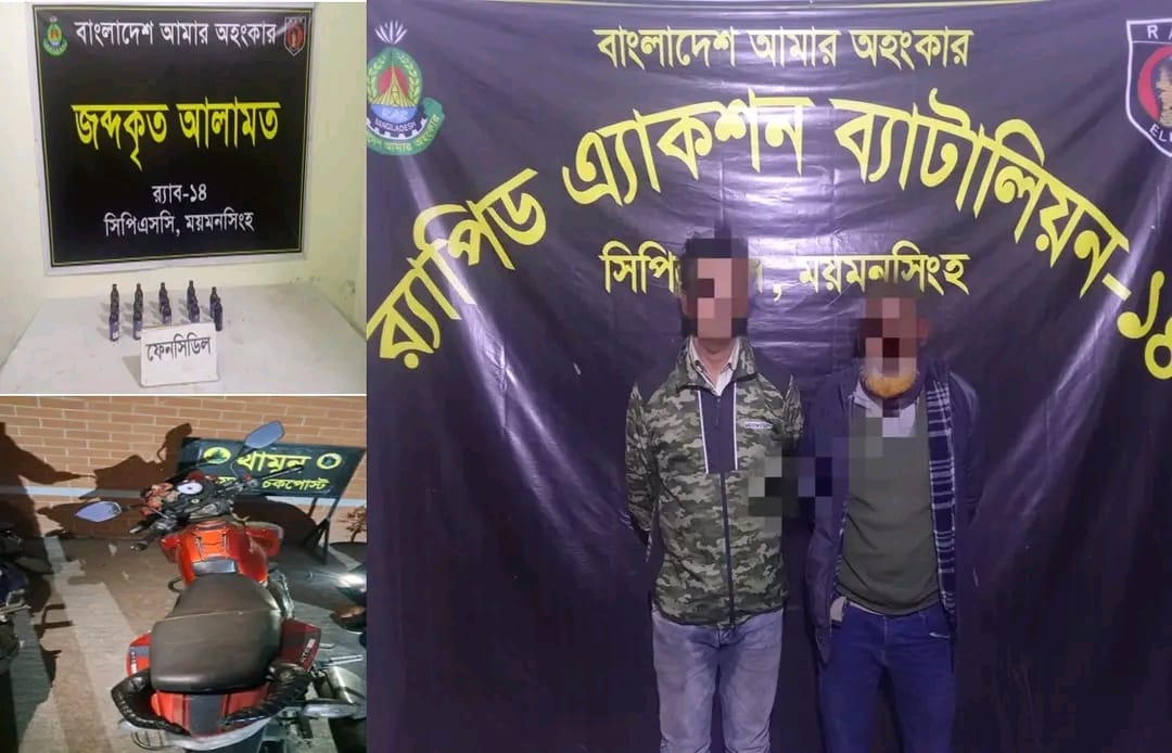 ময়মনসিংহ সিপিএসসি, র্যাব-১৪, এর আভিযানিক দল গোপন সংবাদের ভিত্তিতে ০৪ ফেব্রুয়ারী ২০২৬খ্রিঃ বিকাল অনুমান ১৬৪৫ ঘটিকায় ময়মনসিংহ জেলার মুক্তাগাছা থানাধীন ভাবকির মোড় সংলগ্ন মেসার্স জান্নাত ফার্নিচার এর সামনে ময়মনসিংহ-জামালপুর রোডে পাকা রাস্তার উপর চেকপোস্ট স্থাপন করে। উক্ত চেকপোস্টে একটি মোটরসাইকেল চেকপোস্ট অতিক্রম করাকালীন সিগন্যাল দিয়ে থামিয়ে মাদককারবারি ১। মোঃ ভুট্টো মিয়া (৫০), থানা-পলাশবাড়ী, ২। মোঃ আরিফুল আহাদ (৪২), থানা-গাইবান্ধা সদর, উভয় জেলা- গাইবান্ধাদের আটক করে। উপস্থিত সাক্ষীদের উপস্থিতিতে তাদের জিজ্ঞাসাবাদে অবৈধ মাদকদ্রব্য ফেন্সিডিল থাকার কথা স্বীকার করে। তাদের দেওয়া তথ্যে এবং দেখানো মতে মোটরসাইকেলে বক্সের ভিতর বিশেষ কায়দায় রক্ষিত অবৈধ মাদকদ্রব্য ১৪ (চৌদ্দ) বোতল ফেন্সিডিল উদ্ধার করতঃ ০৩ টি মোবাইল ফোন এবং মোটরসাইকেল জব্দ করতে সক্ষম হয়। উদ্ধারকৃত অবৈধ মাদক দ্রব্য ফেন্সিডিল এর আনুমানিক বাজার মূল্য ২৮,০০০/-(আটাশ হাজার) টাকা।